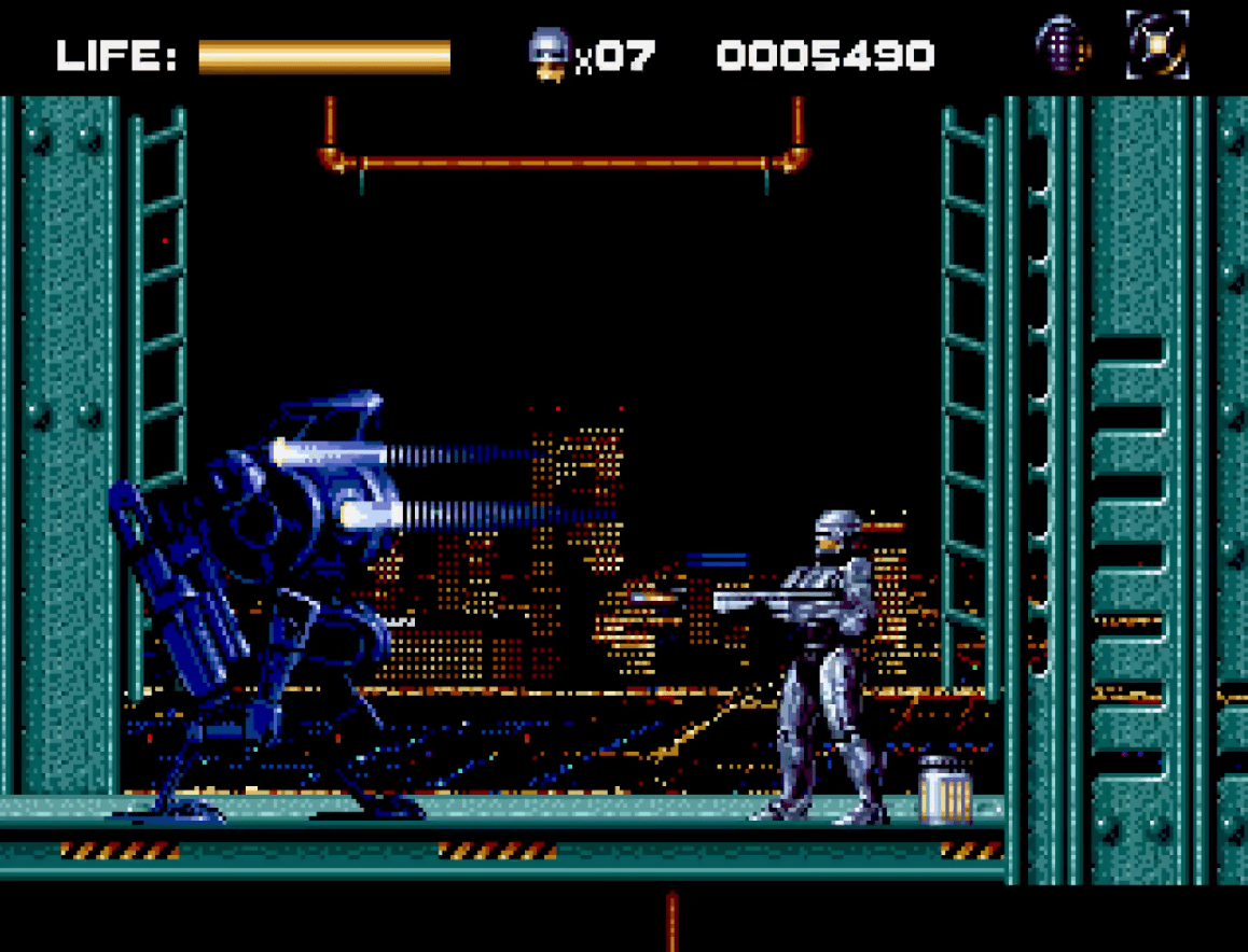 Boss battles punctuate each level, forcing confrontations with ED-209, RoboCain, and various Skynet constructions in confined, single-screen arenas. This design choice becomes problematic since RoboCop's jump is basically a slight hop, making it nearly impossible to avoid damage when fighting room-filling bosses.