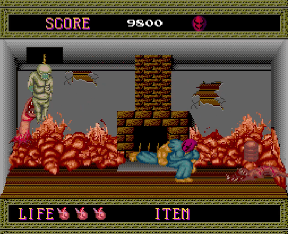 The North American release made some concessions to avoid controversy. Rick's mask changed from white to red to distance him from Jason Voorhees comparisons. The meat cleaver in early stages became a wooden board. Religious imagery got toned down. Despite these changes, the game still managed to feel genuinely edgy for 1990.